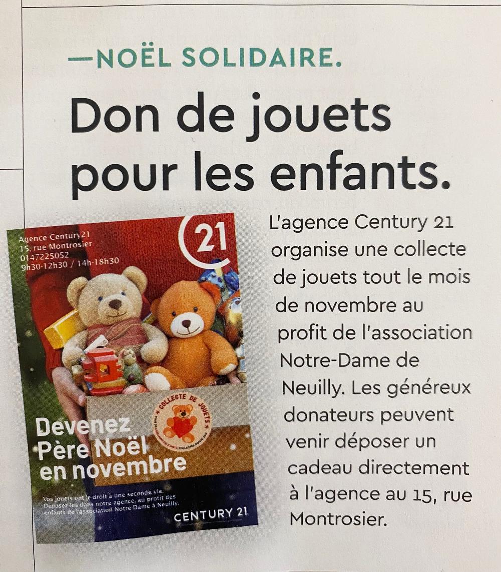 L’agence Century21 Eric Sellier à Neuilly sur Seine organise cette collecte chaque année pour l’Association Notre -Dame, située 42 avenue du Roule à Neuilly sur Seine. Elle s’occupe de personnes en situation d’handicap. https://www.association-notre-dame.org/